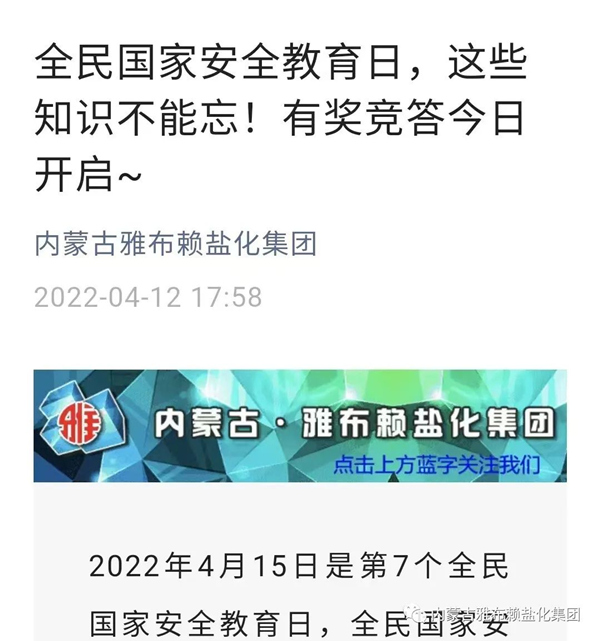 為確;顒(dòng)取得實(shí)效,公司圍繞“樹牢總體國(guó)家安全觀,感悟新時(shí)代國(guó)家安全成就,為迎接黨的二十大勝利召開營(yíng)造良好氛圍”這一主題,利用公司微信公眾號(hào)、微信群、網(wǎng)站、橫幅標(biāo)語(yǔ)、宣傳掛圖等多種宣傳形式進(jìn)行了廣泛深入的國(guó)家安全宣傳教育活動(dòng)。并組織黨員、員工積極參加阿拉善盟“全民國(guó)家安全教育日”網(wǎng)上知識(shí)競(jìng)答活動(dòng),引導(dǎo)黨員員工樹立總體國(guó)家安全觀,提升自身安全意識(shí)和保密意識(shí)。