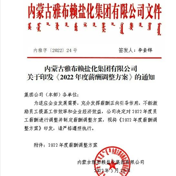 5月30日,雅鹽化集團(tuán)公司召開(kāi)2022年第一次職工代表組長(zhǎng)(擴(kuò)大)會(huì)議,聽(tīng)取、審議并一致討論通過(guò)了《集團(tuán)公司本部2022年度薪酬調(diào)整的議案》。會(huì)議決定在2021年工資基礎(chǔ)上,分別為中層管理人員、一般管理人員、生產(chǎn)人員、后勤服務(wù)人員等上調(diào)6%-8%的工資;為內(nèi)退人員每人每月增資100元。